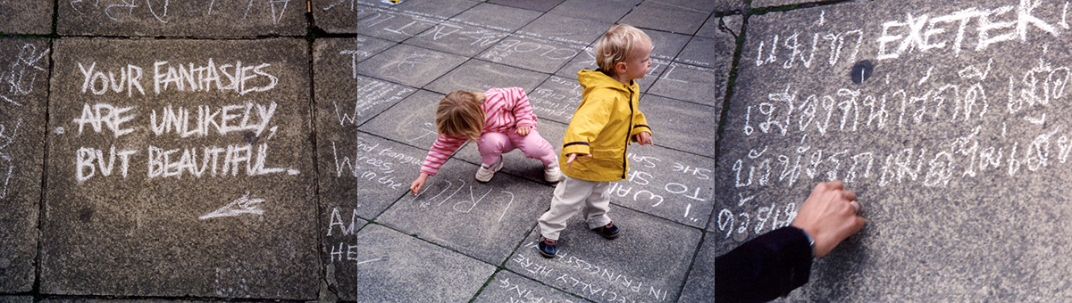 A paving stone is a page or a stage, but it is also a public space and a piece of real estate. It is space for an intervention by the participant as collaborator. We invited Saturday shoppers to join us in writing messages from Exeter to friends and relatives elsewhere. The messages were chalked upon the paving stones of Princesshay pedestrian precinct.